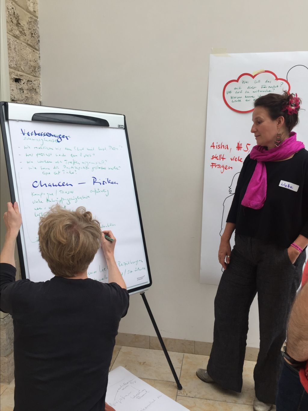 Zunächst standen wir vor der Aufgabe, konkrete Personen und ihre möglichen Fragen an die Stadtgeschichte zu visualisieren. So verloren wir etwas den Schrecken vor dem ominösen «breiten Publikum», an das wir uns gerne richten möchten. Wen stellen wir uns vor? Einen Vater, Logistiker, vor etlichen Jahren in die Schweiz und nach Basel eingewandert, begleitet von seinem Kind, das tausend Fragen hat? Oder zwei Teenager, die sich für die Klimastreiks interessieren, aber nicht recht wissen, was sie mit Geschichte anfangen sollen? Eine Coiffeuse mittleren Alters, die sich vor allem für die Geschichte ihres Quartiers und ihres Berufs interessiert? Oder einen jungen Kaderangestellten, der Geschichte gerne nutzt, um in Stehlunches mit kurzweiliger Unterhaltung zu brillieren? Unserer Phantasie waren keine Grenzen gesetzt!